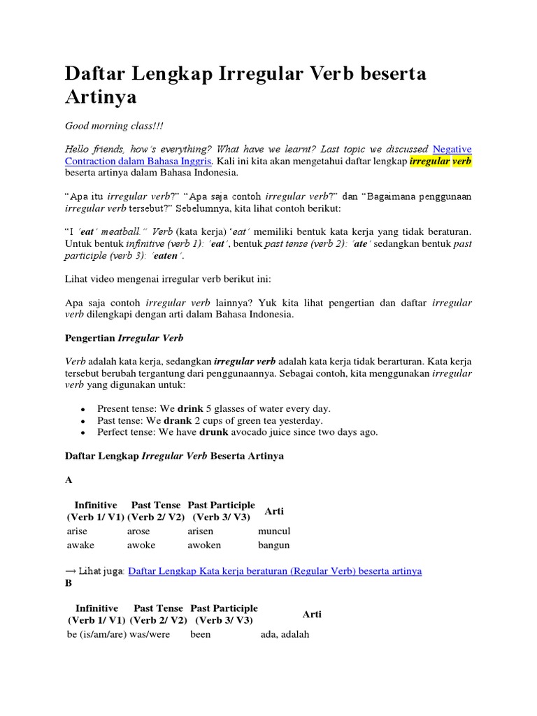 Regular dan irregular verb adalah perubahan bentuk kata kerja yang menyesuaikan waktu penggunaan kalimat yang diatur dalam tenses. Contoh kalimat have dan has beserta artinya. Daftar lengkap irregular verb beserta artinya. Outride outrode outridden menunggangi lebih baik, cepat, dan jauh. Kalau ya, kamu harus banget klik materi dari kampung inggris satu ini!