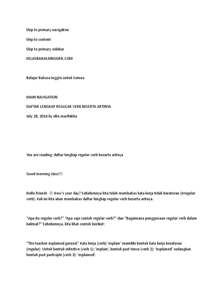 Hal yang harus diperhatikan dalam membuat contoh kalimat past tense adalah memberikan keterangan waktu (adverb of time) agar pembaca atau orang yang diajak bicara dapat memahami bahwa pekerjaan yang kita maksud terjadi. Regular dan irregular verb adalah pembagian verb berdasarkan perubahan waktu atau cara penulisannya. Daftar lengkap ireguler docx daftar lengkap regular verb beserta artinya. Beranda english lessons contoh kalimat regular dan irregular verb. Daftar lengkap irregular verb beserta artinya. Itulah beberapa contoh irregular verbs yang sering banget saya temui. Kill, killed, killed = membunuh 6. Verb ada dua jenisnya, irregular verb dan regular verb. Penjelasan regular verb dan daftar lengkap regular verb beserta artinya dalam bahasa indonesia dari a sebelumnya kita telah membahas kata kerja tidak beraturan (irregular verb). Terdapat tiga bentuk regular verb untuk setiap kata kerja, yaitu contoh: Pengertian pola kalimat, unsur dan contohnya. Hal tersebut dikarenakan verb memiliki banyak sekali klasifikasi. Follow, followed, followed = mengikuti (mengikuti orang lain) 4.